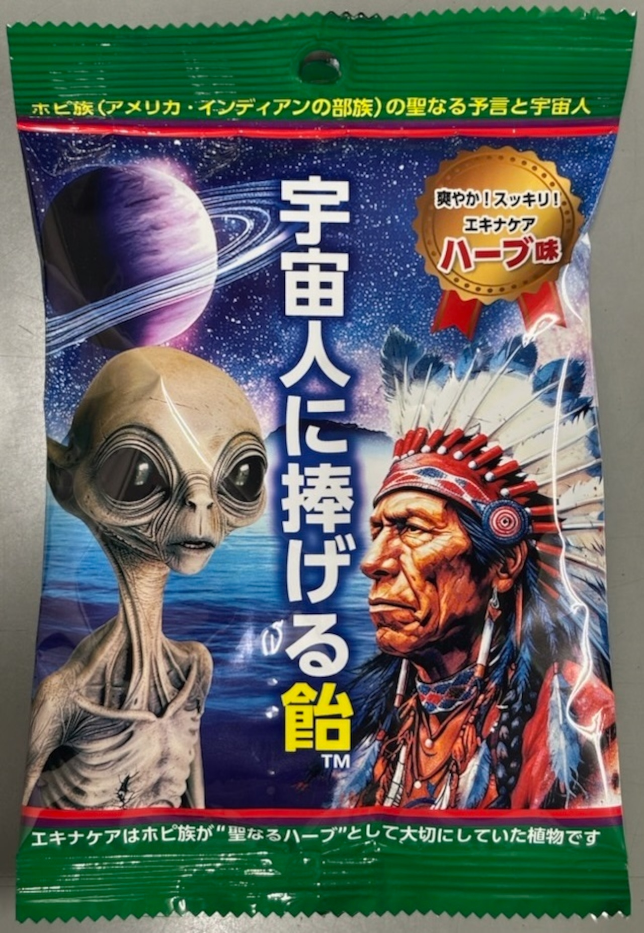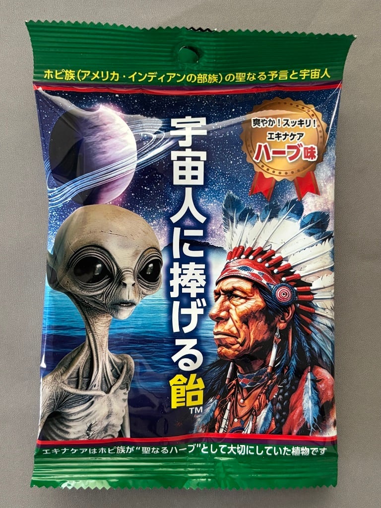 宇宙人を思わせるユニークなパッケージデザインの「宇宙人に捧げる飴」は、エキナケアハーブを贅沢に使用したのど飴です。自然の力を感じながら、喉をいたわる一品をご堪能いただけます。